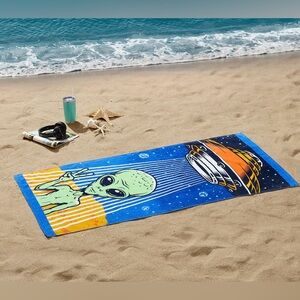 Bright, multi-colored towel features vibrant pattern of a peaceful green alien and an orange spaceship on a blue space background