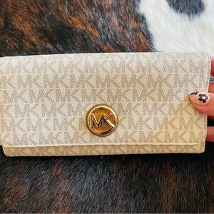 Michael Kors Jet Set Large Logo Shoulder Bag with matching Fulton Flap Wallet in Vanilla/Acorn. Authentic from the Michael Kors Store. Never used, it has just sat in my closet since purchased. No dust bag, comes from a pet and smoke free home. Purse originally $558 & wallet $178