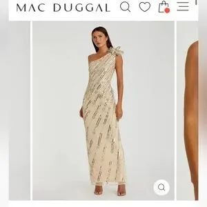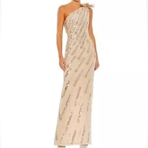 This gown channels old Hollywood glamor with a modern edge. Hand-embellished mesh overlays the polyester blend lining, creating an alluring asymmetrical one-shoulder neckline accented by dainty feathers, beads and sequins.