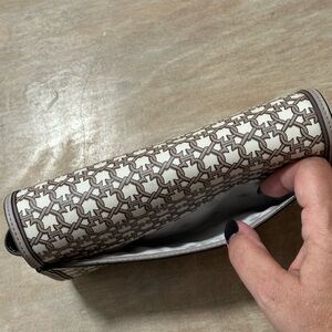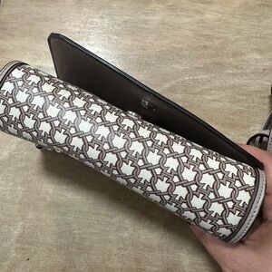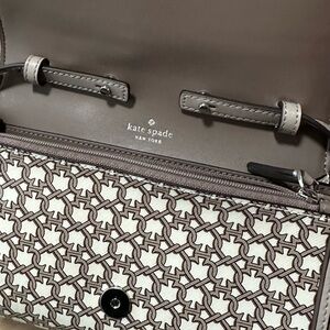 Spade Link small crossbody bag. Excellent condition. Taupe & Cream. Interior card pockets and zipper pocket. Snap closure. Ksny pin mount allows for removable strap. 22” handle drop. Bag size. 7.6”w x 4.7”h x 1.7”d.