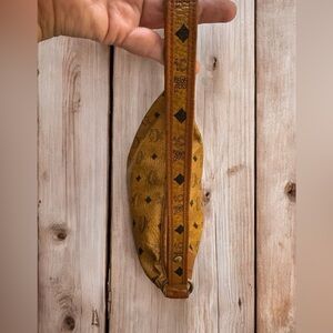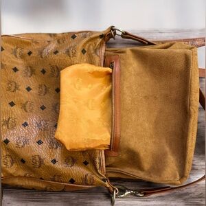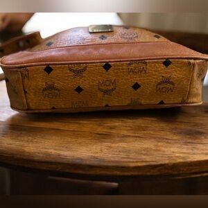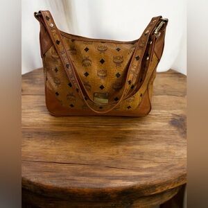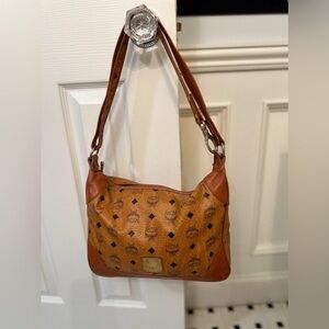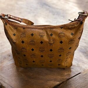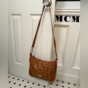 Authentic MCM cognac hobo crossbody with suede lining, gold tone hardware, single adjustable shoulder strap(see photos), leather trim embellishment, one interior zip pocket with nylon logo lining. There are a few ink stains at the bottom of the suede lining and the logo plate on the exterior has some scratches. Pricing reduced to consider these flaws. Please view all photos.