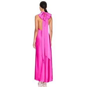 The power of pink drives the delight of a halter-neck gown finished with a flourishing bow at the back to amp up your exit.