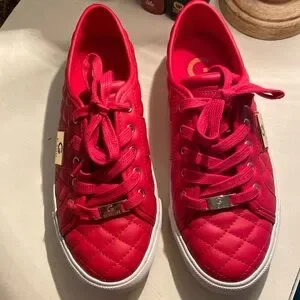 Shoe looks brand new with no issues with material. White is pretty clean however bottom of shoe needs to be washed. Size 7 red and gold emblem.