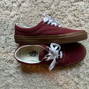 Burgundy Vans Doheny with tan sole. Size 7 mens / 8.5 women’s, in great condition! Super comfortable and easy to style.