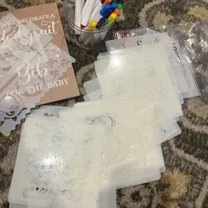 Baby shower game/activity, onesies and bib painting. Comes with: sign, fabric markers, and 33 stencils. Still in excellent condition.