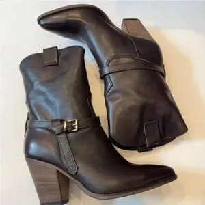Step into style with the HARDY bootie. Featuring a pointed toe and stacked wood heel, this western-inspired boot also includes a buckle detail and pull tabs. Perfect for any look, these boots are sure to add an edgy touch to your wardrobe.