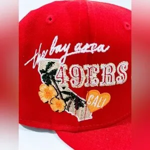 SF 49ERS RED Fitted Hat with THE BAY AREA 49ERS CALI PATCH. Unisex.