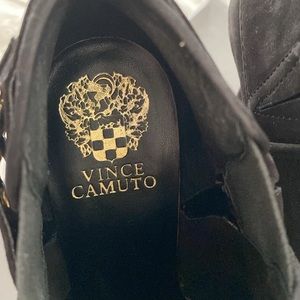 Vince Camuto Elaina black suede booties with gold tone hardware. Size 8 in great used condition. Worn twice with some marking of suede as is common when you drive with suede shoes. Box is not original to shoes but included. Date night girls night