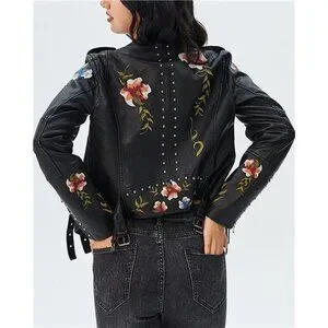 Liberate your inner rebel with this luxurious embroidered motorcycle jacket! Featuring a classic black faux leather exterior with delicate floral embroidery and studded details throughout. Windproof and water repellent outer shell. Flattering mid-length construction and body hugging, slim fit High grade synthetic vegan leather. Zip up closure. Collared neckline. Take your look to the next level with this daring studded faux leather jacket.