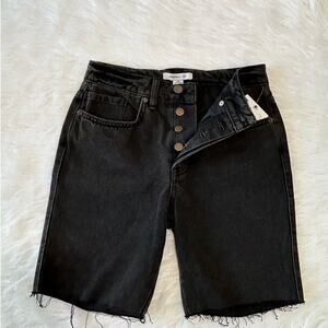 Step into summer with these stylish black denim shorts. Featuring a high-waisted design and a trendy button-up fly with four visible buttons, these shorts offer both comfort and a flattering fit. The frayed hem adds a touch of edgy charm, perfect for casual outings or a laid-back day at the beach. Equipped with belt loops and standard back pockets, these shorts are as functional as they are fashionable. Pair them with your favorite top and sandals for an effortlessly cool look.