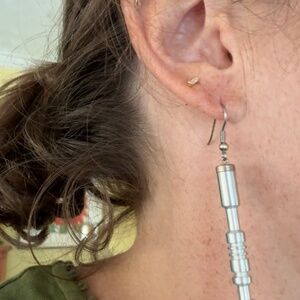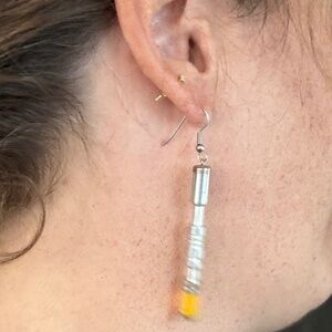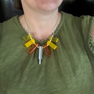 Eclectic artist-made lucite necklace and earrings set. Necklace features a sterling silver rope chain with fluorescent lucite bars in orange and yellow; the centerpiece is a cantilevering silver bar in a rigid silver frame. Lightweight (hollow?) silver earrings resembling an industrial rod with fluorescent gold lucite at base. These items were originally purchased from an art gallery in Traverse City, MI, but artist is currently unknown. There is a small silver tag bearing the makers mark "mnp" near the lobster clasp. In addition metal stamps on the necklace claps include what appears to be a "925" designating it as sterling silver and the word "Italy." Gently pre-loved.