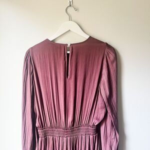 Evereve Hailey Mini Dress in Mauve. A ruffled skirt and back keyhole detail elevate this fun and flirty dress by EVEREVE. Crafted in crinkle satin fabric, this mini dress features a shirred neckline, elastic waistband, and long sleeves with smocked cuffs. Style for any occasion with heels and drop earrings. In excellent condition. No holes, rips, or stains. Ours is a pet & smoke free home.