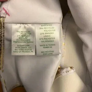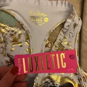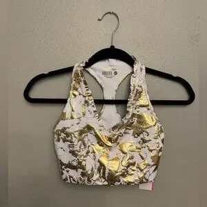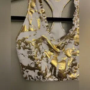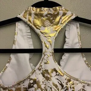 Sold out online. Active Powerstretch, moisture-wicking material with UPF 50+ protection. White with marbled gold foil pattern. V-neckline. Racerback style. Lightly ruffled around neckline.