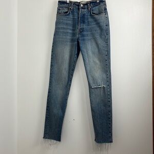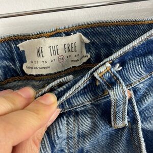 We the Free Distressed Skinny High Rise Jeans Condition: GUC (There's an orange stain above the knee rip--you might have luck with stain remover) Materials: Cotton, Spandex Waist: 27" Inseam: 29" Front Rise: 12" *These may fit a little smaller than what the size 28 size tag says. *Measurements are Approximate