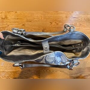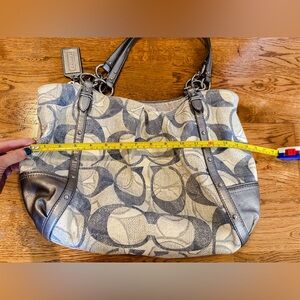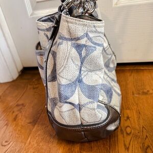 Coach Alexandra Signature Blue, White and Silver Chain Shoulder Bag. Coach blue, white and silver chain shoulder bag with magnetic tab closure, large outside pocket, zip top interior middle section Interior fully lined & Cellphone/ Multifunction Pockets Interior zip pocket on side. Measurements are Double handles with 10", 15”W, 11”H. In Great used condition, small marks inside of purse on inner lining shown in photos. Smoke free home.