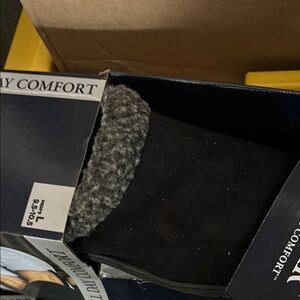 Stay cozy and comfortable with these black loafers & slip-ons slippers from Haggar. Featuring a soft interior, these slippers are perfect for indoor use. Keep your feet warm and stylish with these versatile slip-ons.