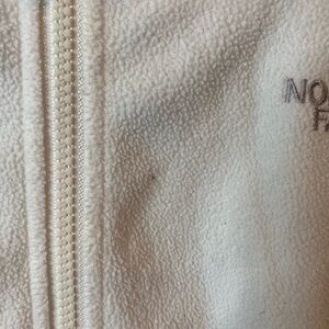 North Face fleece jacket. White and grey! Has one small spot on front barely noticeable and a spot on sleeve (pictured). Besides that it has a lot of life left. Fall and winter is upon us so grab this before season starts.