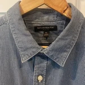 Banana Republic XL Men’s long sleeve, navy & pin white strip button up shirt in excellent condition! Preowned with no flaws. Mens XL slim fit. The photos don’t seem to do this shirt justice so I took closeup photos of the fabric so you can get a better idea on the great quality material. The shirt is 98% cotton, 2% spandex, Durable quality material non-transparent fabric and includes extra buttons. Bundles will receive exclusive discounts open to all offers😉