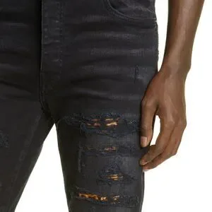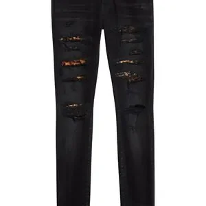 Authentic Amiri Jeans- Flashes of leopard patches peeking through the rips and tears bring a touch of wild style to stretchy Italian-denim jeans befitting a biker or rocker.