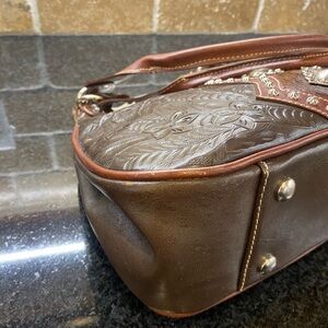 American West genuine full grain leather zip top tote. Hand stained, hand tooled and handcrafted. 13” x 8” x 4” with 13” drop straps. There are some light scuff in non conspicuous areas as seen in the pics. Excellent pre-owned condition. $120