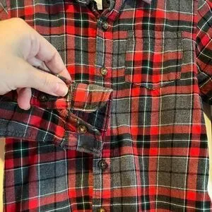 Cute plaid print soft flannel shirt in red and gray plaid.. Very good preloved condition.