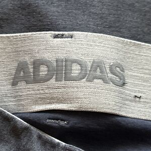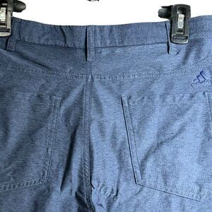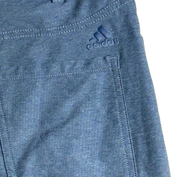Adidas men's active golf shorts. Flat front with five pocket style. Classic adidas logo on button and rivets. Logo on back. Stretch, comfort fit, climalite. Blue heather color.