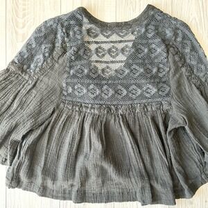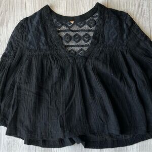 Free People Crochet Back Crop Top Size S. In good condition with no staining or damage noted. The size tag is missing but it measures a size small. Flared crop sleeves with back lace/crochet detailing.
