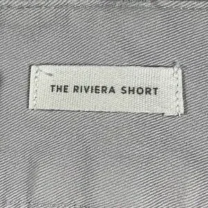 Good condition, comfortable, 97% cotton 3% spandex, grey color, The Riveria Short, flat front, zipper fly, double clasp and button closure, rear welt pockets, 3.5” inseam 10” rise 33” waist