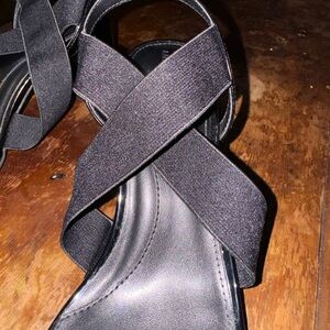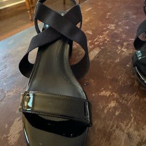 EUC. Black Anne Klein patent and fabric sandals. Body of sandal, heel and cross strap are patent. Two fabric (elastic) pieces run across the foot in an X. Open toed. Can be worn casually or for business. These have been worn twice and are in almost perfect condition. Size 10.