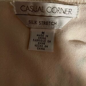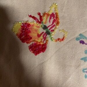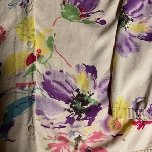 Very pretty cardigan sweater is cream colored with floral print and one sequin butterfly. Neckline, sleeve cuffs, and bottom of sweater are ribbed. 75% silk/25% nylon.