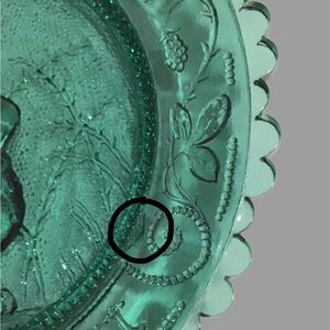 In the center of this Pairpoint glass plate #8 is Peter Rabbit holding a walking stick. The color looks like a light teal, but is is titled”Green Briar Green. Peter Rabbit seems to be listening to Jenny Wren, who is perched on a nearby branch. The center background is textured, and the outer edge features blackberry vines. The mould was introduced in 1975 and is based on a classic Harrison Cady illustration. The Pairpoint logo, a “P” in a diamond, is shown in the last photo. Details include: