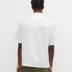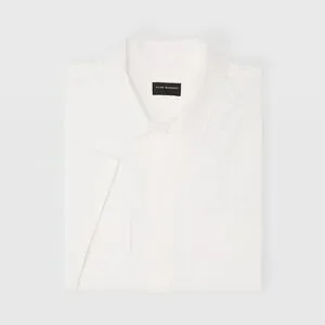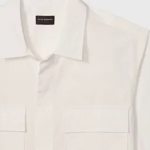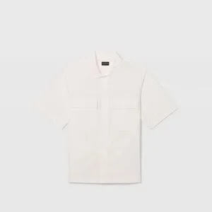 Point collar; concealed placket with button closures; chest pockets; straight hem; short sleeves