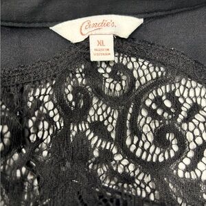 This is a women’s open front lace top. Size XL. Candie’s brand. Color black. This is in good condition with no rips or stains.