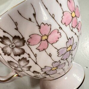 This elegant teacup and saucer set features a delicate pink floral design accented with gold trim, ideal for refined tea settings or display.