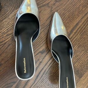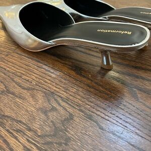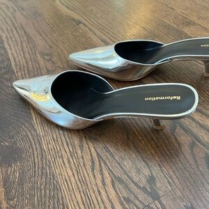 NWT and bags Reformation kitten heel mule in silver mirror! Size 9 (runs 1/2 size small). Love these but can’t wear because of my foot surgery. Brand new never worn! Sold out online. Great with jeans and perfect heel height.