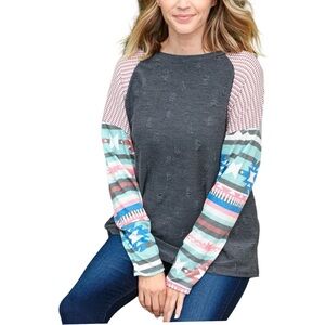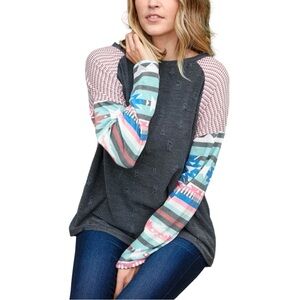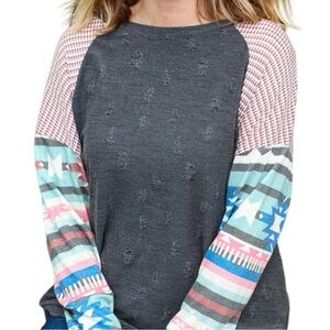 • Distressed jacquard thermal knit raglan top made with ethnic Aztec print in a loose fitting dolman style.