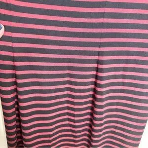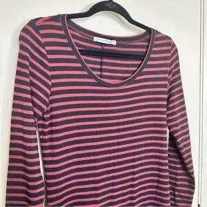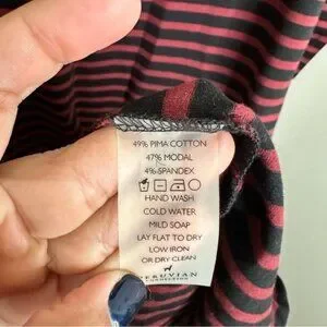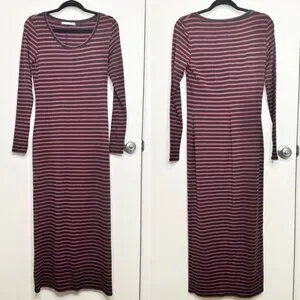 Effortless t-shirt dressing, this wardrobe essential is perfect for travels near and far. Sensuously soft and drapy in pima (49%), modal (47%) and spandex (4%), our bordeaux and black striped jersey dress is long and sleek, with a scooped neck and full-length sleeves.