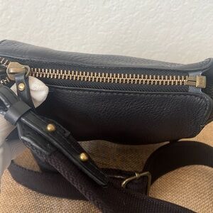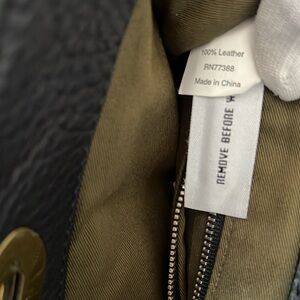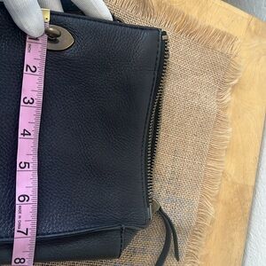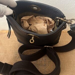 This is a lovely bag with Black Leather Cowhide & Brass hardware , Convertible it can be an open Bucket Bag or closed also extend the size of it by adjusting the side zippers very unique .