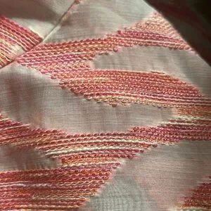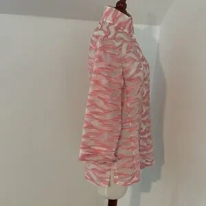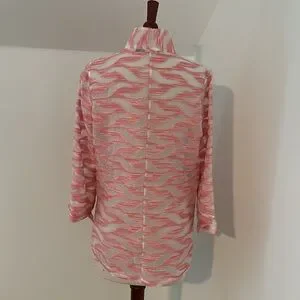 This beautiful top has a stand up color with button front and side splits at base. Sleeves are 3/4 length with cuff. Embroidered fabric reads pink but has orange thread in it as well. Very rich looking.