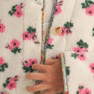 The sweetest long sleeve floral print sherpa shearling jacket with cutie contrast piping detail. Front pockets. Lining.