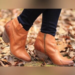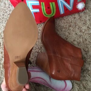 Gorgeous cognac brown leather authentic Frye booties (style Reina). Size 5.5. They are so beautiful and the heel is comfortable and cute.