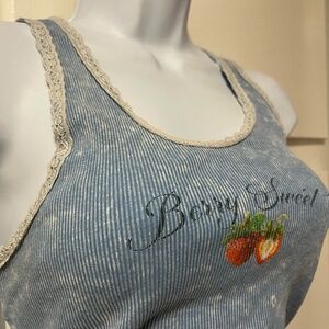 Full Tilt Berry Sweet Tank Top. Graphic screened at center chest. Rib knit construction. Scoop neck. Fixed shoulder straps. Lace trim. Fitted silhouette. 100% Cotton. Machine wash. Imported.