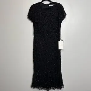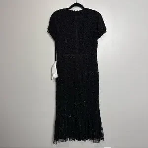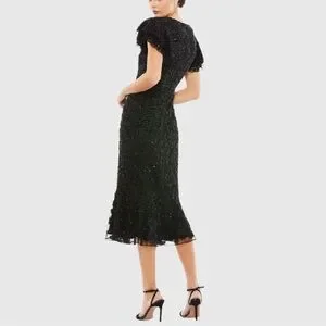 Mac Duggal HAND BEADED FLOUNCE SLEEVE MIDI DRESS Black Size 12 Style 10771