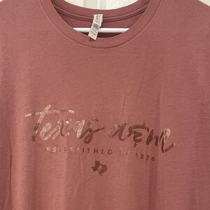 Canvas Texas A&M short sleeve soft tee. Size large. Pink shirt with “Texas a&m” written in rose gold lettering on the front. Approximate measurements listed below!