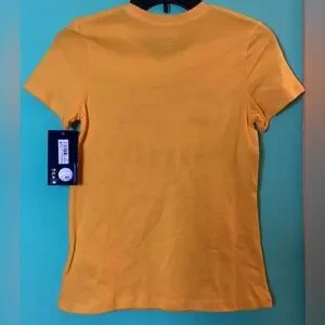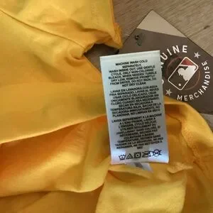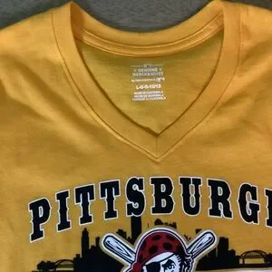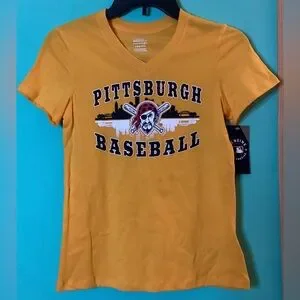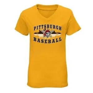This is a new with tags MLB Pittsburgh Pirates Girls' V-Neck T-Shirt in a girls size large (10/12). The shirt is in the color yellow and reads Pittsburgh Baseball. The shirt is sold out online and is officially licensed by the Major League Baseball association. It is made of 100% cotton.