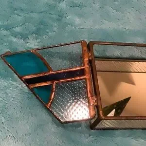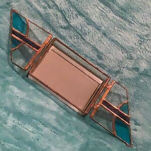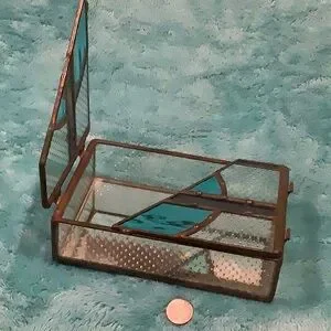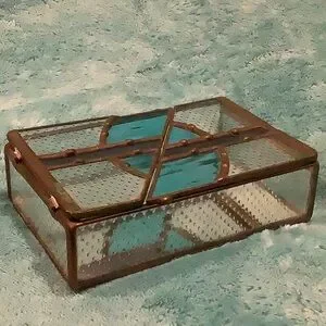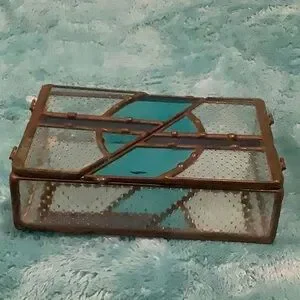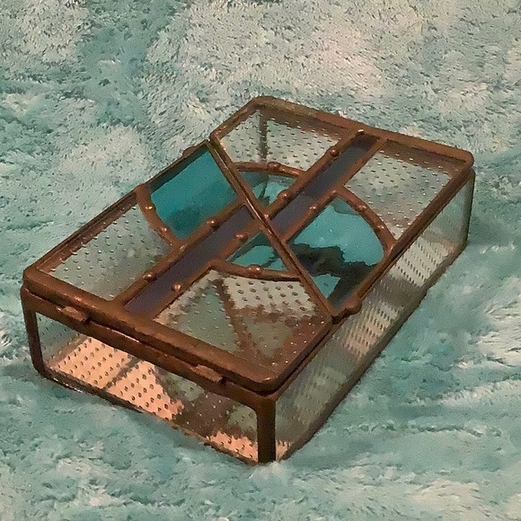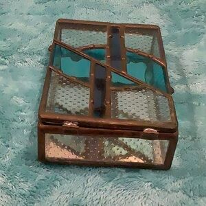 Stained Glass Jewelry Box Trinket Box NWT Handcrafted Art Piece with wing door opening top. Dark antiqued copper foil with clear textured glass and aqua and blue glass design accents. Handcrafted by Glass Mountain Creations TX USA. Measures 4” X 6” X 1.50”