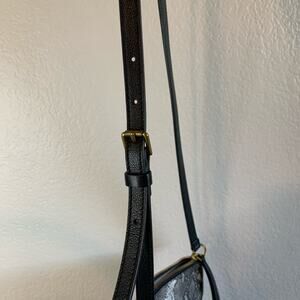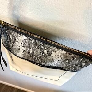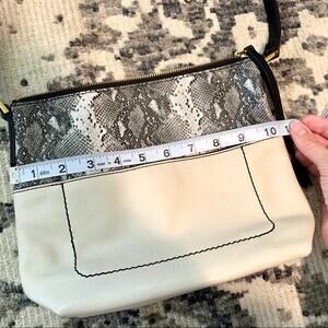 This is an absolutely gorgeous leather purse by Fossil. It is a cream and grey snakeskin combo with black adjustable strap. The bottom potion is cream with a snap pocket on the front and it is grey snakeskin with a zip on the top. The inside is a grey fabric, very clean, 2 pockets, one with a zipper. There are some very subtle tiny signs of wear (pictured), but overall in excellent condition! No major flaws. Approximately 10.5” x 9”