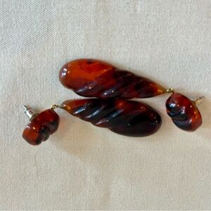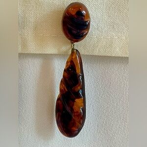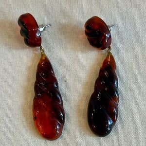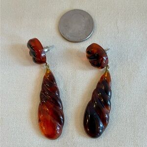 These tortoise shell inspired Lucite earrings dangle with two tiers. The top is an oval shaped disc with three ribs on the outside surface. The teardrop bottom is textured with five diagonal ribs on the surface, and the back is flat (as visible in photos). Earrings measures 6 cm drop from post and have stainless steel backs and silver plated posts.