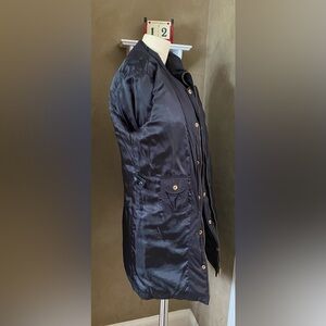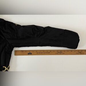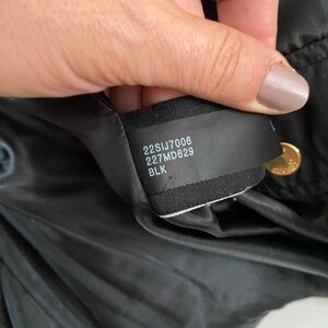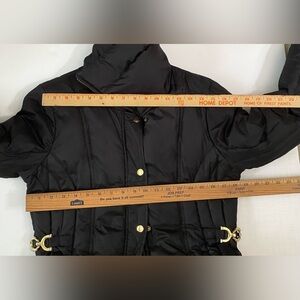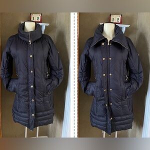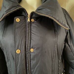 Guess Down Puffer Jacket Full Zip Down Feather Black Women Small Winter. Used, but still in good condition. Gold tone zip. front zip pockets, inner pocket too. Gold tone hardware, embroidered logo on left shoulder, button flap covers zipper, a couple small holes on left chest from brooch. Measurements (approximate while lying flat - see attached photos). Please double check the measurements as there are no returns. No holds. Smoke free home. Please see my pictures for details as they are part of my description. Please visit my other listings for more items and designers clothing.