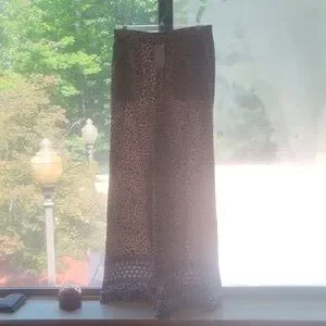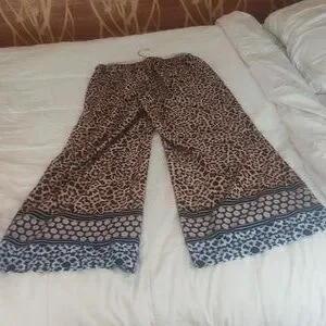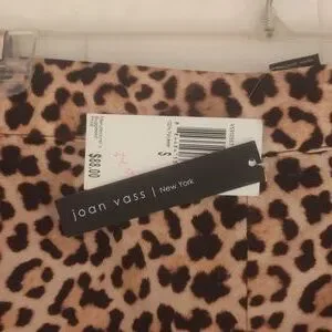 Wide Leg Resort Style Pants by Joan Vass New York. Size Small. 30'in inseam. 27'in waist. Light weight and with functional pockets, these cheetah print pants will compliment any blue swimsuit.